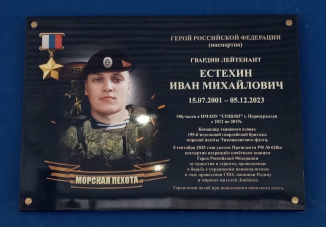Торжественное мероприятие открытия  мемориальной доски морскому пехотинцу, Герою Российской Федерации Естехину Ивану Михайловичу состоялось в школе 5 г.Первоуральска. Отныне школа будет носить имя Естехина И.М.